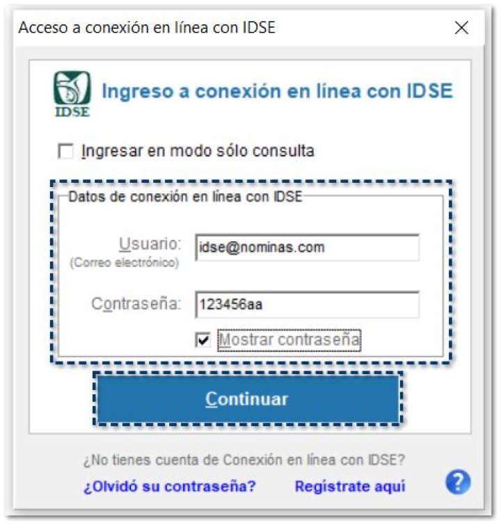 En la ventana Acceso a conexión en línea con IDSE, podrás visualizar 3 secciones: