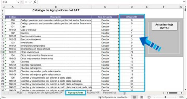 En el modelo de Excel® "Asignación Agrupadores SAT" se realizaron cambios para que el usuario tenga opción de realizar una asignación más ágil de rubros NIF a cada una de sus cuentas contables y no tenga que realizar la asignación desde el catálogo de cuentas contables, esto es útil cuando el catálogo de cuentas es muy grande y se lleva a cabo mediante la Hoja electrónica, con la opción de seleccionar un rango de cuentas, validando las reglas de negocio, permitiendo que la asignación de rubros a las cuentas contables sea más rápida.