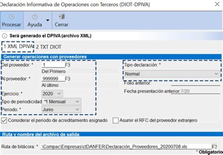 Selecciona la pestaña XML DPIVA, y captura el rango de proveedores, ejercicio, tipo de periodicidad, periodo, tipo de declaración y haz clic en el botón Procesar. | |||
