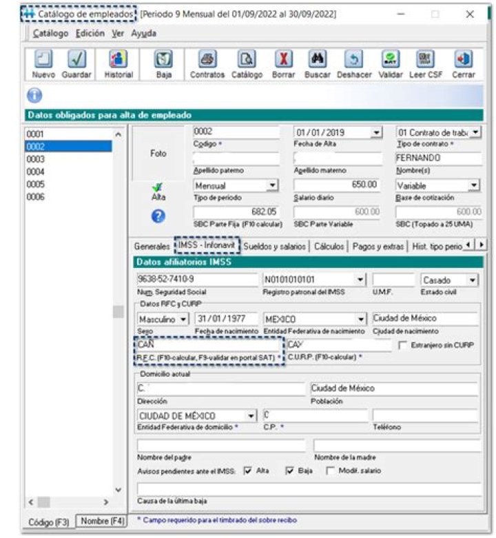 Al ingresar al catálogo de Empleados, en la pestaña IMSS - Infonavit, sección Datos RFC y CURP, se valida mediante el F9 en el campo R.F.C. que el dato capturado sea correcto y coincida con la Lista de RFC inscritos no cancelados del SAT y de esta manera unificar con el R.F.C. capturado.