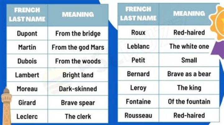 Answer: French last names can provide clues about a person's ancestry, region of origin, and even their social status. For example, the last name " Dubois " is derived from the French word for "wood," indicating that the person's ancestor may have lived in a wooded area or worked as a woodworker.