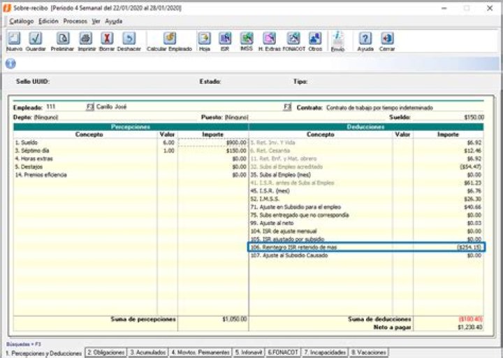 Y en el sobre-recibo del último periodo del mes podrás observar el importe correspondiente en el concepto D106. Reintegro ISR retenido de mas: