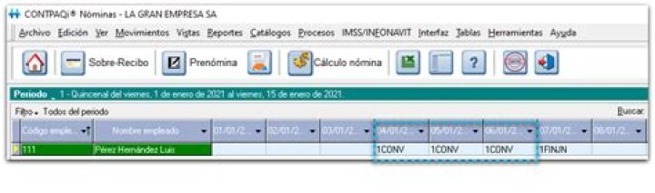 En el registro de la prenómina DyH puedes observar que está capturada la incidencia CONV los días 4 a 6 de enero.