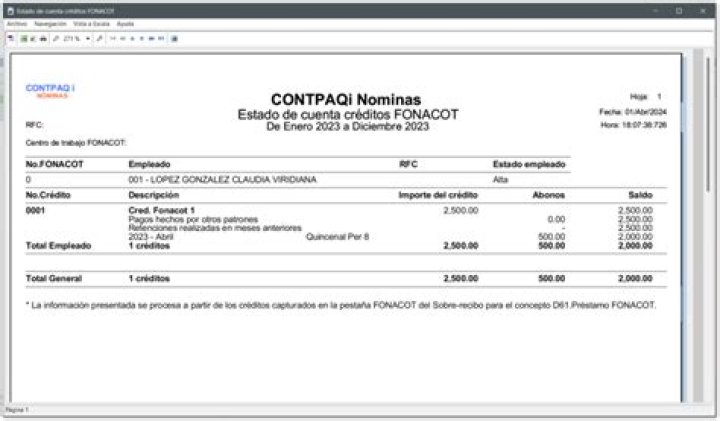 Al hacer clic en cualquier área sensible al contexto, Código empleado y Nombre, se desplegará el reporte Estado de cuenta créditos FONACOT con información más detallada: