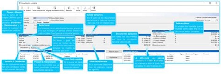 Una vez que selecciones la cuenta bancaria y la conciliación bancaria que vas a conciliar, se mostrarán todos los saldos que están involucrados en el periodo correspondiente entre la fecha inicial y final de la conciliación, que son: los saldos contables, saldos bancarios y saldos por conciliar, así como los movimientos contables y documentos bancarios.